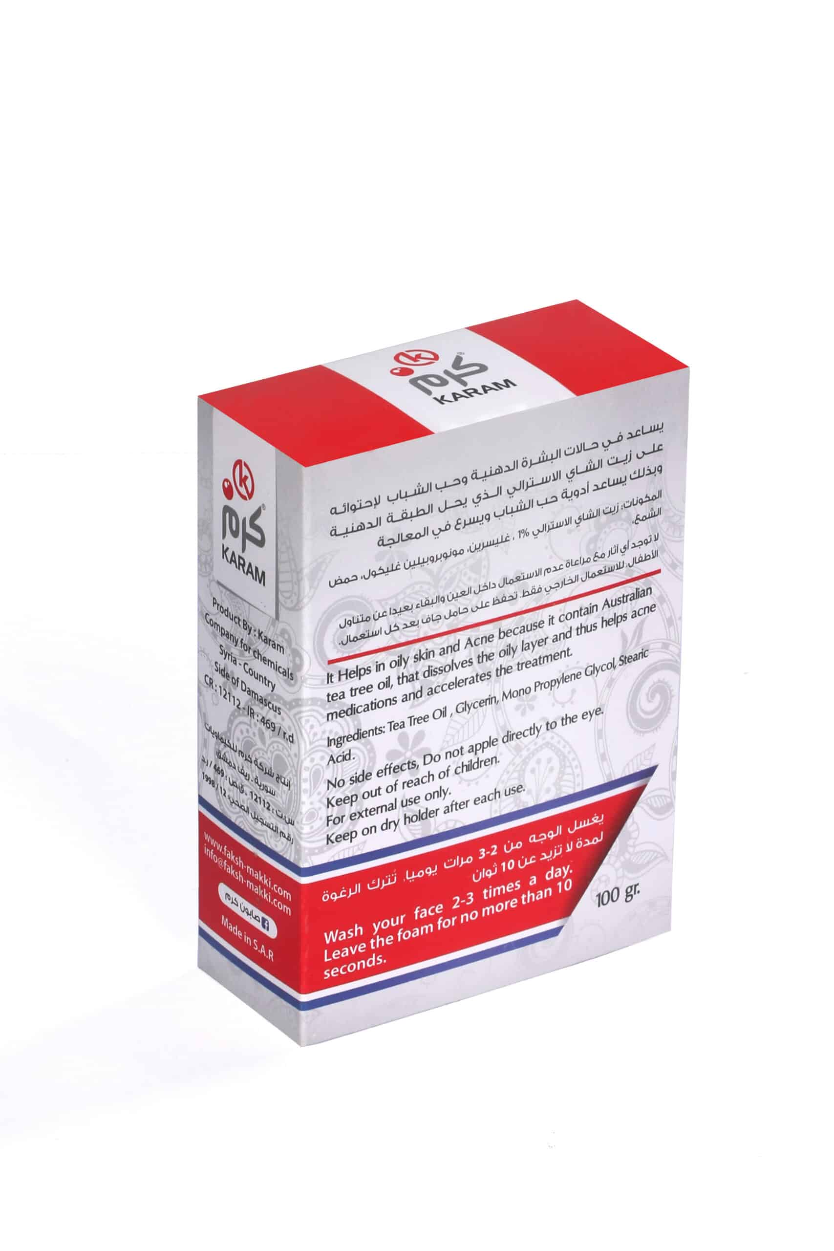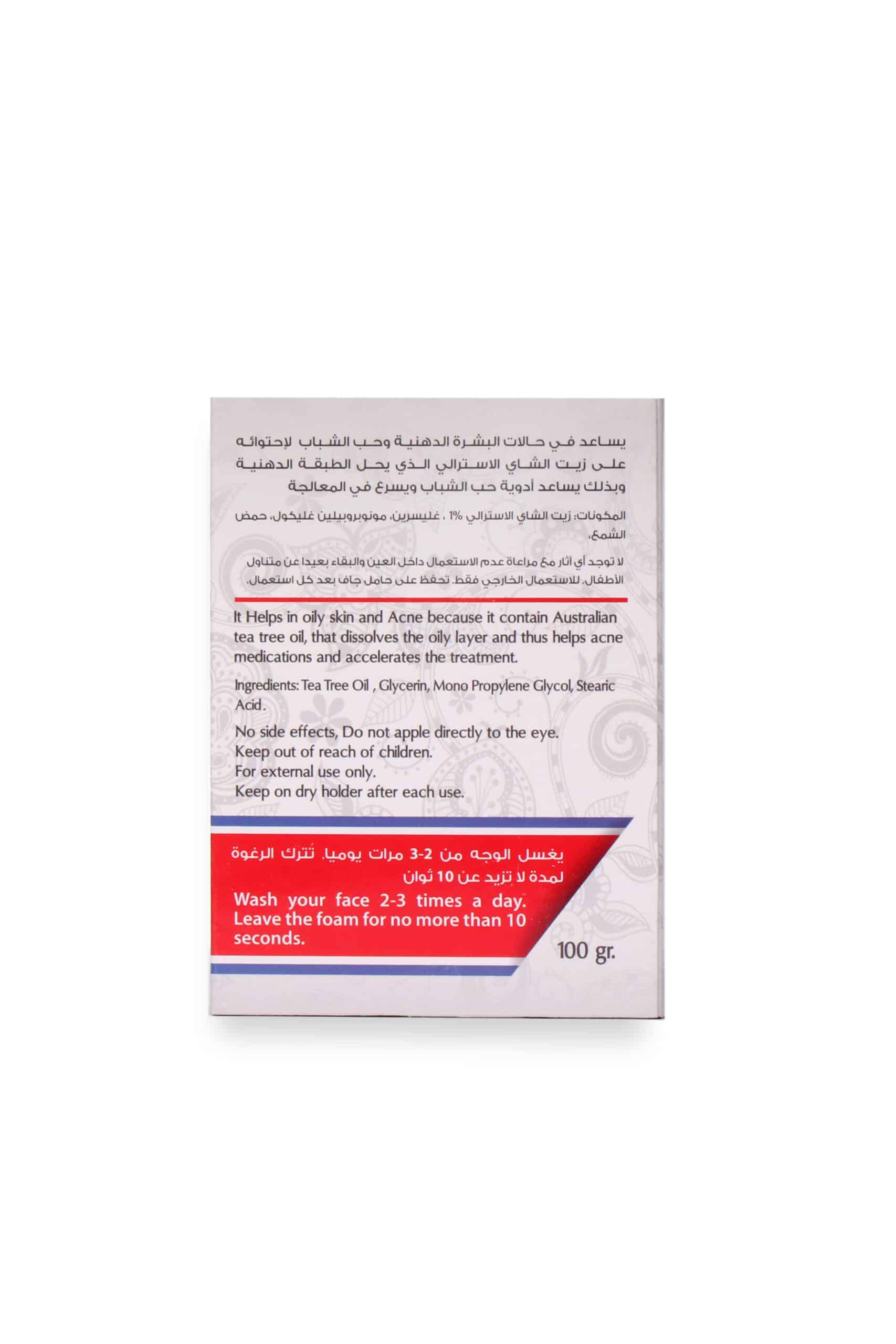 Purify and Balance Your Oily Skin Karam T.T.O (Tea Tree Oil) Soap is your natural solution for managing oily and acne-prone skin. Leveraging the powerful antiseptic properties of Australian Tea Tree Oil, this soap works to dissolve the oily layer that clogs pores, helping to prevent breakouts and support your skin’s recovery.